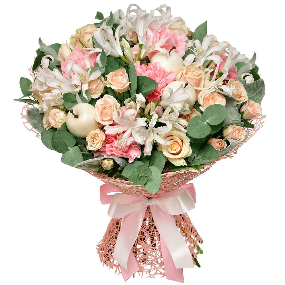 На фото представлен образец. Объем букета зависит от выбранного вами размера. Точное количество цветов и цветовую гамму вы можете уточнить у менеджера по телефону.