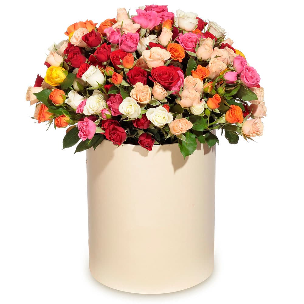 На фото представлен образец. Объем коробки зависит от выбранного вами размера. Точное количество цветов и цветовую гамму вы можете уточнить у менеджера по телефону.